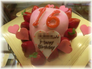 いちごで16のデザイン ピンクのリボンで一層可愛くなりました。